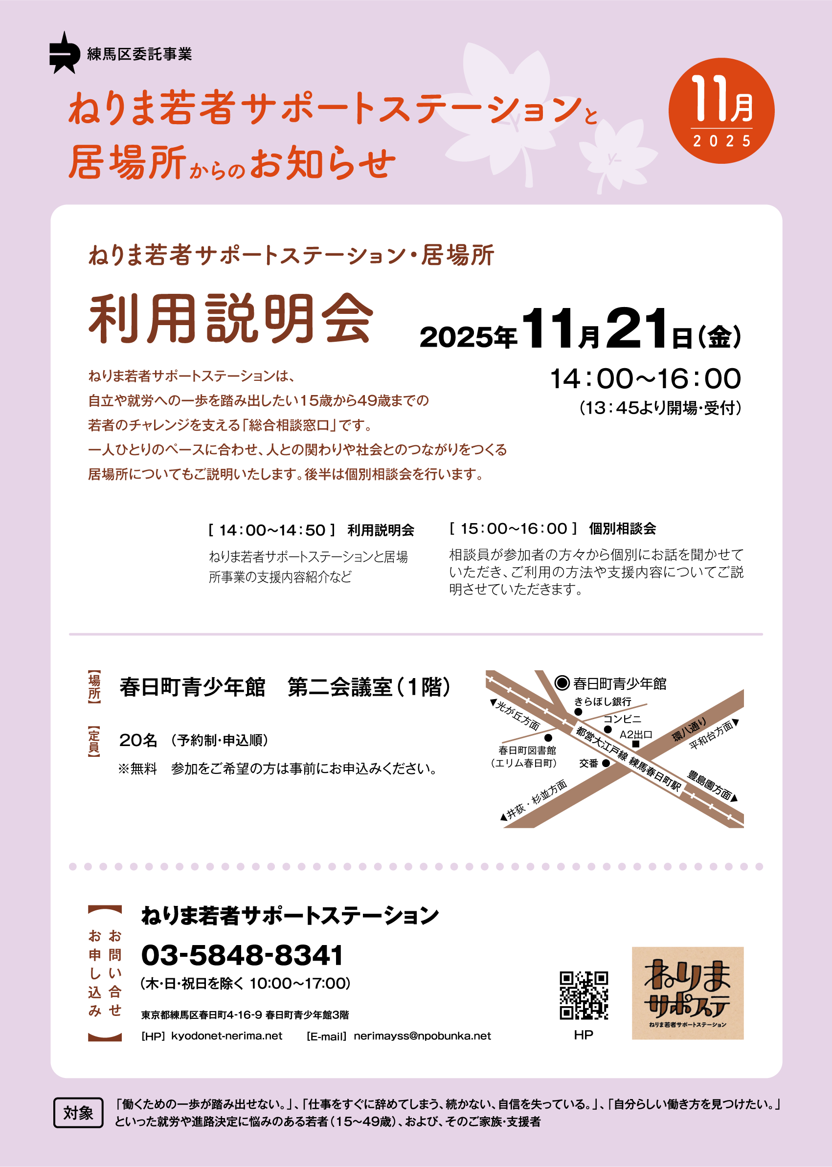 ねりま若者サポートステーションと居場所についてご説明いたします。後半は利用前の疑問や不安にお答えする個別相談会を行います。ぜひ、ご参加ください。