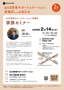 家族セミナーでは、講師としてNPO法人ゆどうふ理事長で臨床心理士の辻岡秀夫氏を招き、「あなたならどう考えますか?~「親」「家族」という立場を少し離れて、一緒に「事例」に向き合ってみる」というテーマでお話しします。
